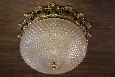 Grote Plafonniere met vergulde messing brede rand en rozet. Heeft een bewerkte glaskap. De plafonniere komt iets van het plafond af.